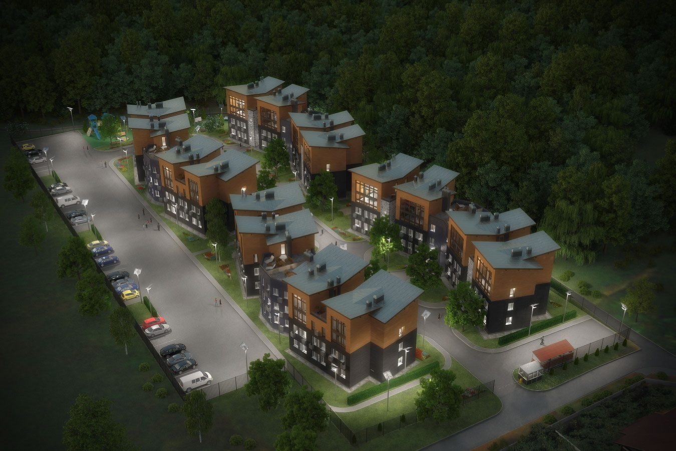 ЖК представляет собой комплекс из 4 малоэтажных многоквартирных домов, построенных по индивидуальному проекту. Высота домов – 3 этажа. Основой зданий выступает железобетонный монолитный каркас с многослойной каменной кладкой. Наружные стены декорированы облицовочным кирпичом, а мансарды – материалами из дерева лиственницы. Проектом предусмотрено панорамное остекление. Лифты в домах отсутствуют. В каждом доме оборудована индивидуальная котельная. Все необходимые коммуникации, а именно газ, вода, электричество и канализация, подводятся централизованно. Для каждой квартиры отведено собственное парковочное место, также предусмотрена парковка для гостей ЖК. Территория комплекса будет охраняться круглосуточно. Застройщиком запланировано обустройство спортивной и детской площадок. Отдельное место предполагается выделить для зоны отдыха и барбекю, в которой будут установлены лавочки и беседки. Благоустройство также предусматривает высадку деревьев, кустарников и озеленение газонов.